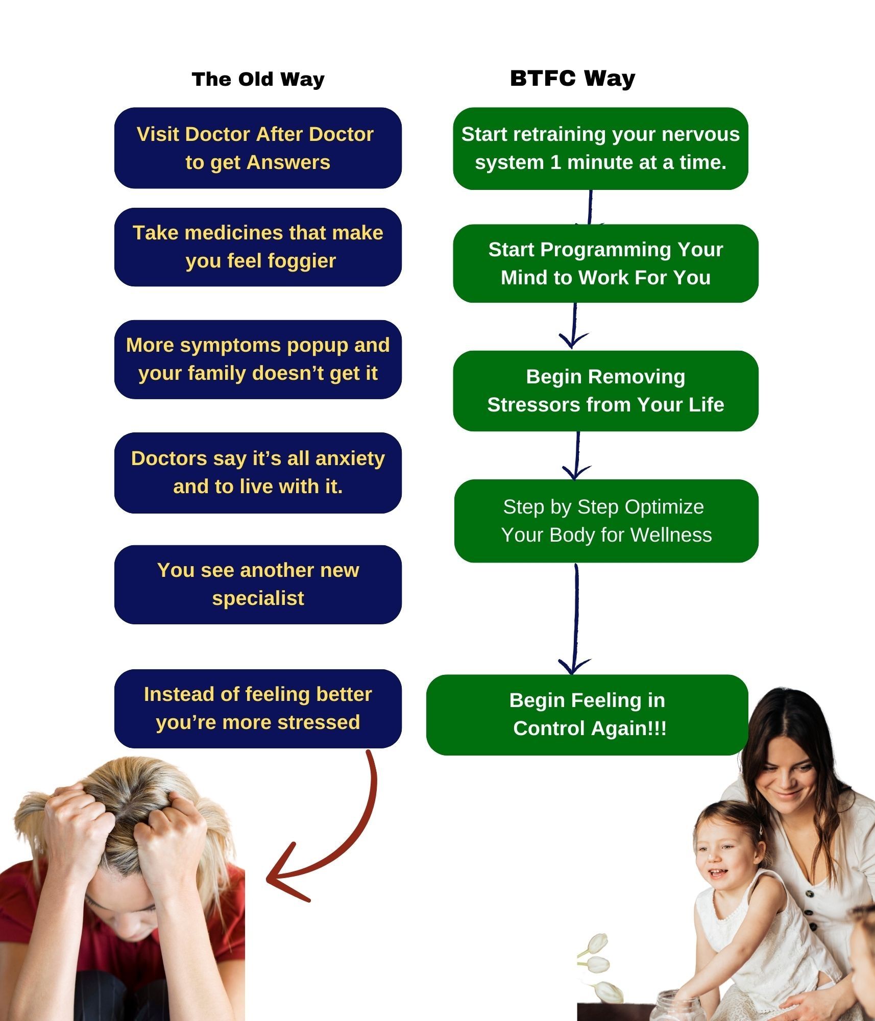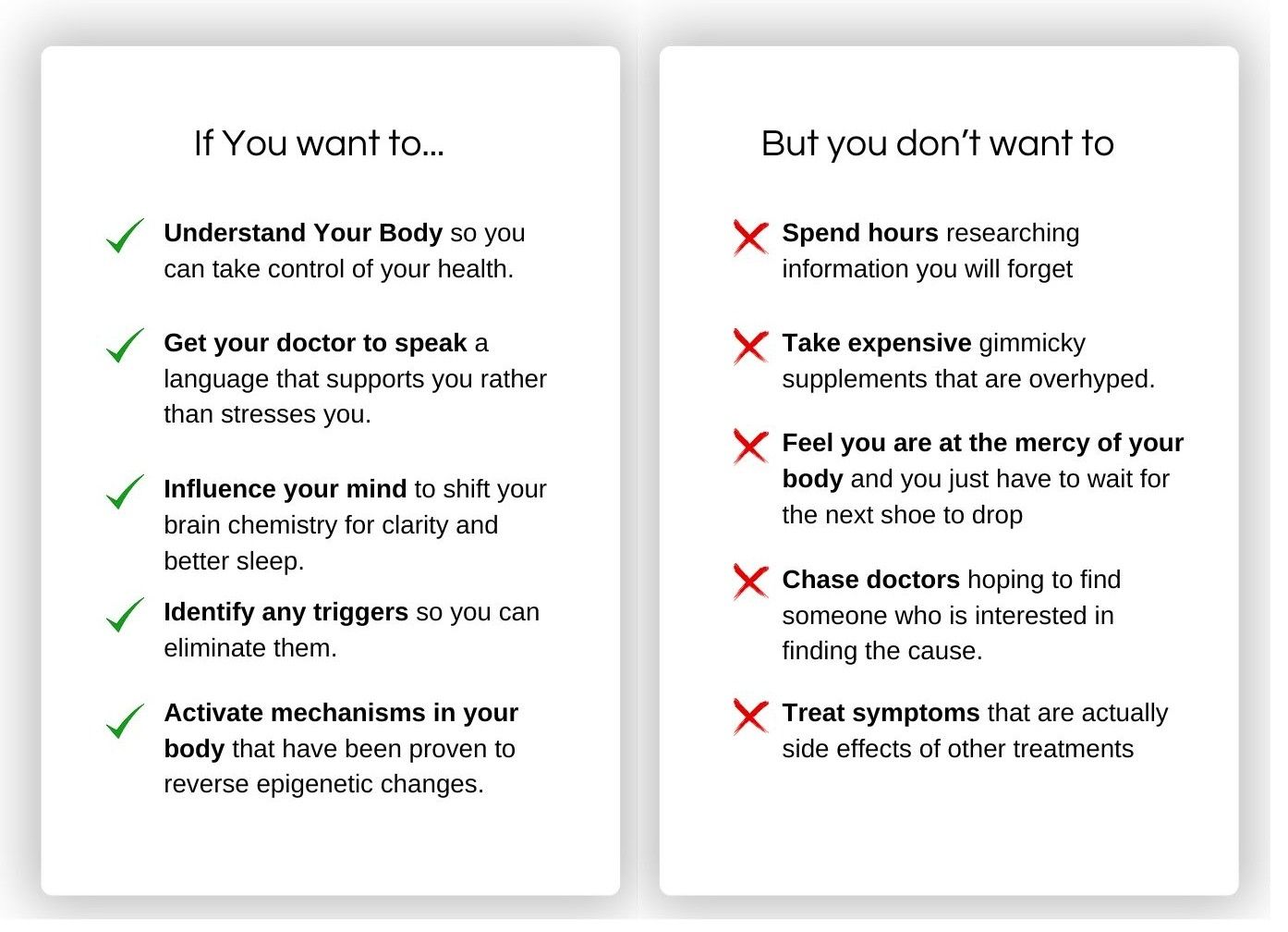 We achieve this by tipping your nervous system into the healing state while identifying any unique triggers you can control without having to rely on professionals who don't take the time to explain how to get your body to work FOR you.